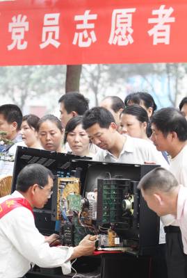 昨(23)日,钟祥市磷矿镇陈安村和东宝区泉口社区联合组织党员志愿者服务队在荆门城区开展了以”党员献爱心、服务聚人心”为主题的党员志愿服务活动,为市民提供了就业服务信息、家电维修、免费义诊、法律咨询等服务。党员志愿者服务队还向居民发放了各种宣传资料。 (本报视界网宁新生摄)