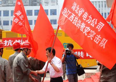 省供电公司支援江西灾区保电23日,湖北供电公司系统19名员工从黄石供电公司集结出发,奔赴江西抚州,支援灾区保电工作。19名供电员工中,有9人是黄石供电公司的发电车操作人员、配电检修维护工以及经验丰富的工程车司机等。22号下午,黄石供电公司接到省公司紧急通知,组织供电应急抢险队奔赴江西灾区负责保电工作,第二天一早出发。市供电公司迅速召开紧急动员会,会后第一时间安排好工程车辆,选定9名精兵强将,为应急抢险队配备了4台发电车,1台抢修车和1台运油车。抢险队将深入江西省抚州市临川区受灾最为严重的罗针镇,保障该镇防汛指挥中心、政府、公安、学校、医院、居民居住区等正常用电。图一:黄石市供电公司负责人为抢险队员授旗。黄石市黄石日报摄影部邱孝威摄电话:13807232603邮编:435002