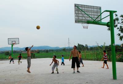 6月23日,武穴市大法寺镇大屋雷村新建成的篮球场上,孩子们和大人在一起尽情地打篮球,享受生活的乐趣。该村从实际出发,坚持以人为本,大力发展农民体育健身工程,创建社会主义新农村建设示范村。本报视界网刘飞摄