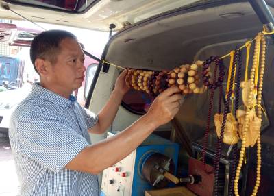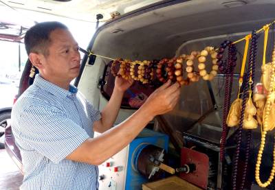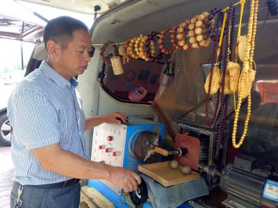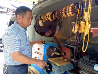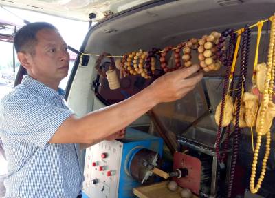 9月18日,竹山县柳林乡公祖村移民包月奎正在加工木珠子,一串串成品“手串”格外醒目。据了解,2011年,包月奎积极响应移民搬迁号召,当年搬迁到该县城关镇马家菜园购买了商品房,随后他到内蒙古等地打工挣钱养家糊口。在内蒙古打工期间,由于他勤学好问,善于学些新鲜事物,看到别人加工的木珠子就情有独钟,通过一年多的学习,他就很快掌握了木珠子全套操作技术和要领。去年下半年他回到竹山后,就在县城南门洞子附近租赁一小间住房当作门店,并添置木珠子加工机械,当地市民晓得他这一手艺后,就纷纷把自己喜爱的废品树木送到他处,经过机械“琢”出饰品,同时他加工的还有小叶紫檀、崖柏、黄连木、黄花梨、黄金檀等手串,满足广大市民需求,年收入超过6万元。(视界网程平 摄影)
