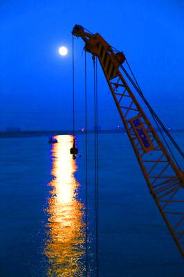 2016年9月16日19时,圆圆的月亮冉冉升起,月光倒映在江面,站在蒙华铁路荆州长江公铁大桥上看去,犹如焊花,格外美丽。(本报通讯员:孟庆虎)