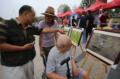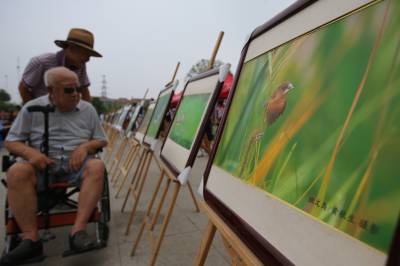 9月19日,人们在观看野生鸟类摄影展。当日,由襄阳市科协、市教育局、市科技局和襄城区政府主办的以“创新放飞梦想,科技引领未来”为主题的2016年全国科普日活动启动仪式,在襄城区岘山文化广场举行。在启动仪式上,众多市民通过科普展板和科普器材,了解、体验了科技的魅力。