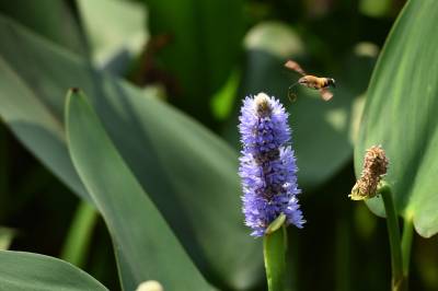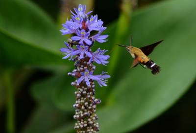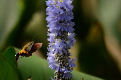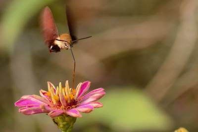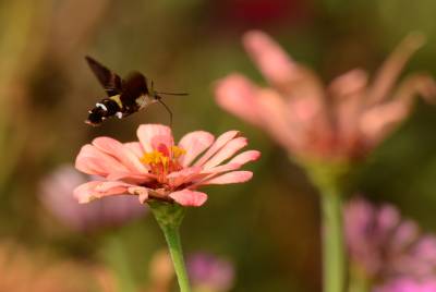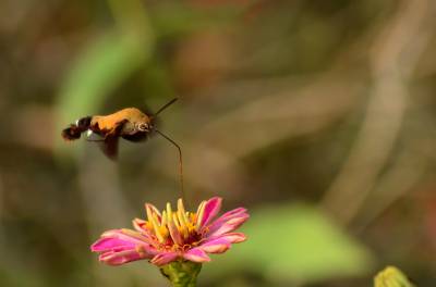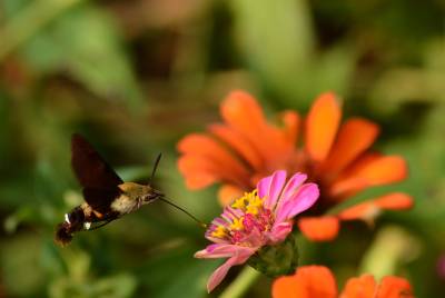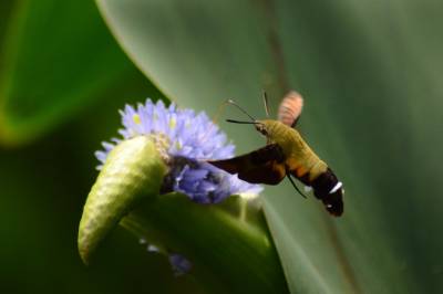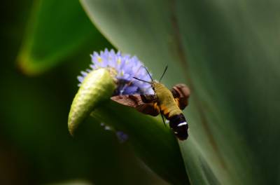 蜂鸟鹰蛾,被称为昆虫世界里的“四不像”,像蝶,和蝶一样白天活动,口器是长长的喙管,且有尖端膨大的触角,还有色彩缤纷、美丽炫目的翅膀;它又像蜜蜂,在夏秋季节飞舞于百花丛中采食花蜜,并发出清晰可闻的嗡嗡声;它还像南美洲的蜂鸟,夜伏昼出,很少休息,取食时,和蜂鸟一样,时而在花间盘旋,时而在花前疾驰。主要分布亚洲、南欧、北非和北美等地。幼虫白色,身体肥硕,头很小呈黑色。在干枯的瓜蒌藤中越冬。翅面暗灰褐色,前翅有黑色纵纹,后翅橙黄色。它是蛾类,为蝶类的同族“近亲”。虫体翅展50mm左右。和蝶不同的是,它腹部粗壮,这种昆虫除了比蜂鸟多出一对触须和翅膀上没有羽毛以外,无论体重、外形还是生活习性、飞行速度都与蜂鸟极其相似,故而被生物学家命名为蜂鸟蛾。