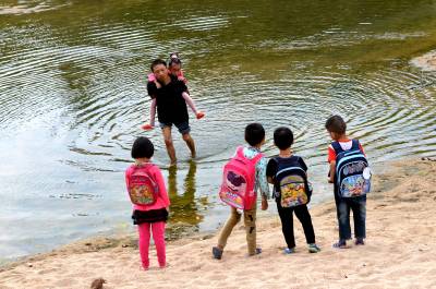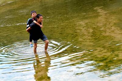 罗田县河铺镇石头板村,是镇上最贫困、最偏远的村之一,距镇上有10多公里的山路。新昌河穿村而过,将村子分隔两岸。小河有百余米宽,除了河中间10多米宽有水,其余的都是沙滩。一到汛期,沙滩全被水淹没。石头板村小学位于小河的西岸,河上没有桥,河东的学生每天都要趟水而过。