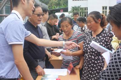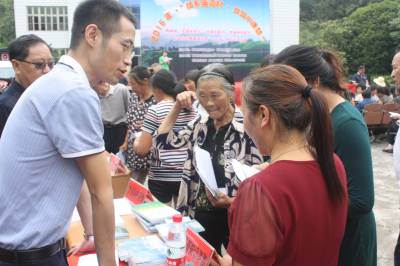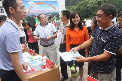 20日,鹤峰县容美镇庙湾村秋高气爽、丹桂飘香,村民们正在收获科普实用技术致富知识。 今年来,鹤峰县各县直单位围绕精准扶贫开展送科普、送文化、送政策、送法律、送医疗“五送下乡”活动,为村民进行科技咨询、健康义诊、文化下村、法律咨询、政策咨询、农技咨询、林业技术咨询、畜牧养殖等科普知识咨询。图为鹤峰县人民政府副县长赵虎(左一)在容美镇庙湾村为村民发放科技资料。(湖北视界网何吉安)