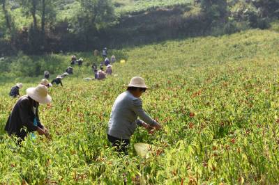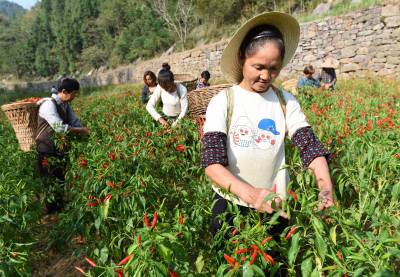 10月22日,建始县业州镇小垭门村农民正忙着采摘上市的朝天椒。今年,建始县硒都红果蔬专业合作社走“大户+贫困户”之路,在全县一些贫困村订单种植朝天椒,使贫困村里贫困户既又种辣椒收入,又可增加劳务收入,加快脱贫致富步伐。本报视界网刘波摄 建始县新闻中心刘波联系电话13032794298