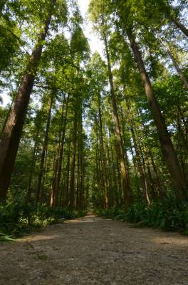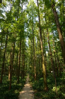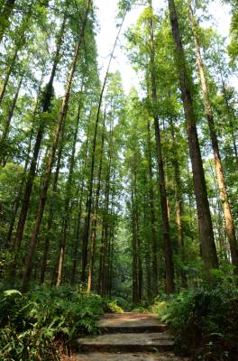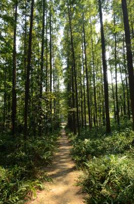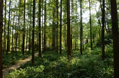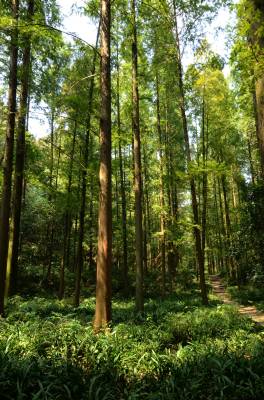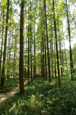 水杉(学名:Metasequoia glyptostroboides Hu & W. C. Cheng):裸子植物杉科。落叶乔木,小枝对生,下垂。叶线形,交互对生,假二列成羽状复叶状,长1-1.7厘米,下面两侧有4-8条气孔线。雌雄同株。球果下垂,近球形,微具4棱,长1.8-2.5厘米,有长柄;种鳞木质,盾形,每种鳞具5~9种子,种子扁平,周围具窄翅。水杉属在中生代白垩纪和新生代约有6~7种,过去认为早已绝灭,1941年中国植物学者在四川万县谋道溪(今称磨刀溪)首次发现这一闻名中外古老珍稀孑遗树种。据近年调查,四川万县、重庆石柱县、湖北利川和湖南龙山、桑植均发现300余年的巨树。水杉适应性强,喜湿润生长快,北京以南各地均有栽培。材质轻软,可供建筑、板料、造纸等用;树姿优美,为庭园观赏树。
