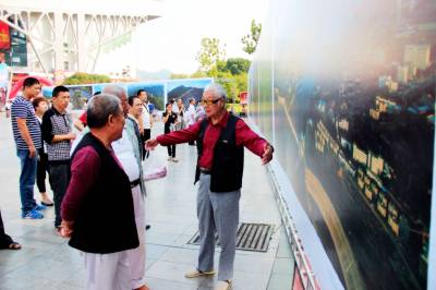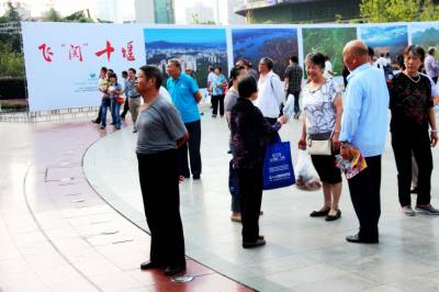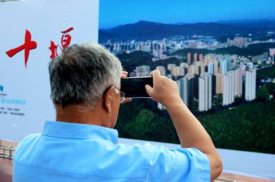 南水北调工程、丹江口水利枢纽、武当仙山……. 幅幅美景吸引了众多市民前来观看。 9月23日,由10幅3×4.66米巨型图片组成的飞“阅”十堰图片展在十堰市人民广场开展。本次展出的作品,第一次从空中的视角见证和记录了车城十堰的新高度、新风貌、新气度,艺术地诠释了车城十堰在经济、社会、城乡面貌发生的巨大变迁以及玉融的自然之美、人文之美。