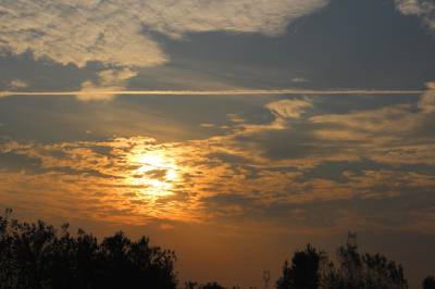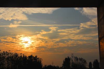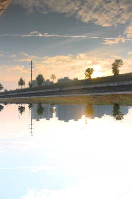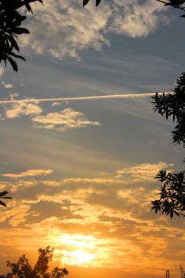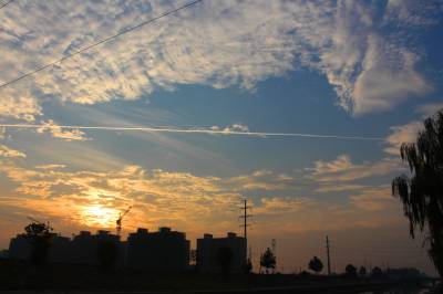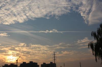 2016年09月24日,清晨的云梦城上空,一架飞机自北向南,从霞光中划过,飞痕一线贯南北,朝霞横贯“一线天”。蓝天,白云,彩霞,飞痕,小草,碧水,倒影,美不胜收。