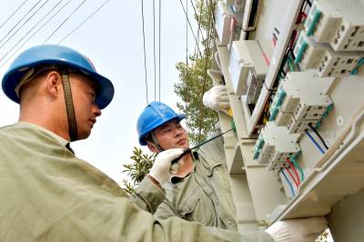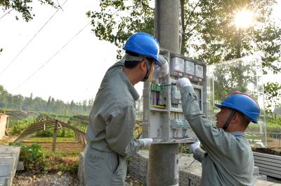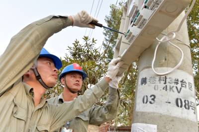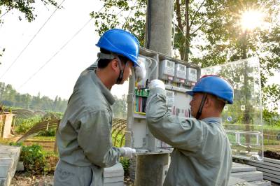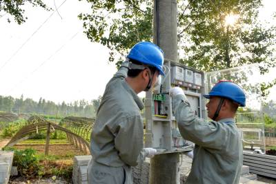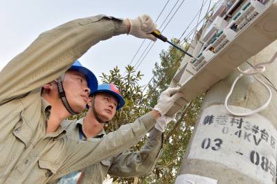 9月23日,老河口市供电公司客户服务中心的工作人员为韩巷3号台区的机井架通电力线路,并安装抽水电表,使韩巷村3组菜园的6眼机井实现了“井井通电”。图为该公司工作人员在安装抽水电表。