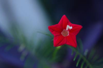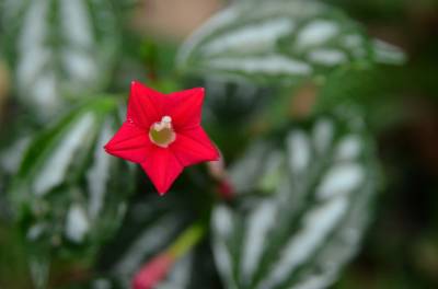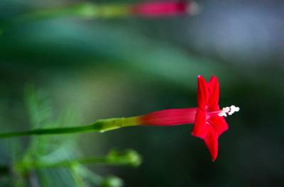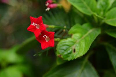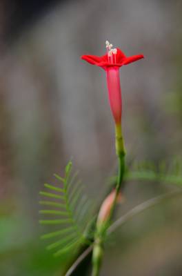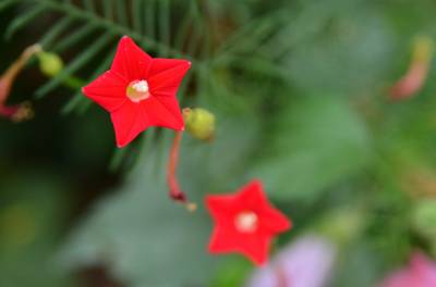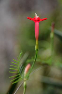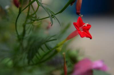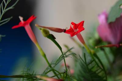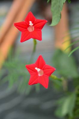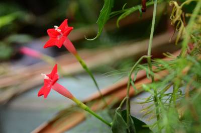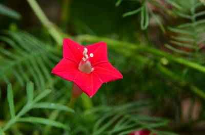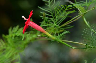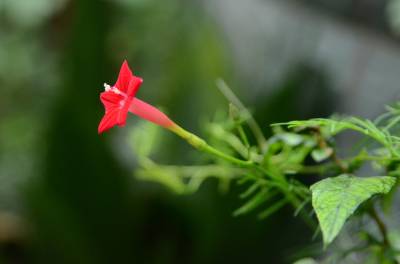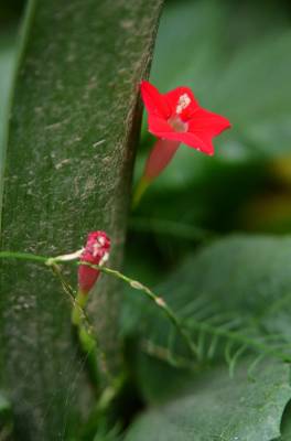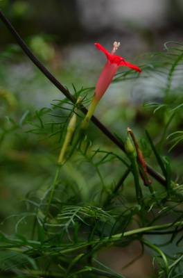 茑萝的细长光滑的蔓生茎,长可达4~5米,柔软,极富攀援性,是理想的绿篱植物。它清晨开花,太阳落山后,花瓣便向里卷起,成苞状。它是一种细致可爱的植物,叶片纤细,似羽毛一样轻盈。每天开放一批,晨开午后即蔫。