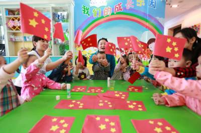 9月26日,竹山县宝丰镇幸福娃幼儿园多形式对孩子们进行“爱国旗”教育。国庆节前夕,该镇各中小学、幼儿园开展升国旗、唱国歌、剪五星、拼国旗、书画展、演讲赛、红歌大家唱等多彩活动,庆祝祖国67周年华诞,以激发广大师生热爱祖国、热爱社会主义、热爱中国共产党的高尚情感,增强广大师生的民族自尊心、自信心和自豪感,践行社会主义核心价值观,弘扬和传递爱国主义精神。