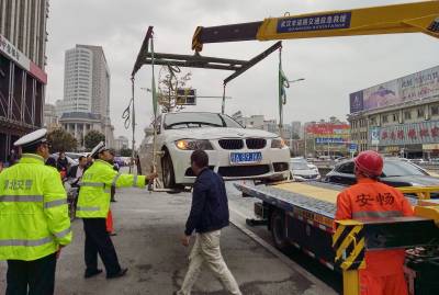 9月29日上午11点多钟,一辆宝马小轿车,违停在汉口发展大道华南国际广场出入囗旁。被正在此处的武汉市江汉区公安分局交通大队巡逻交警发现后,立即呼叫市道路交通应急救援车辆和人员,赶赴违停车辆现场,小心翼翼将违停车吊上了救援车后,拖至指定停车场,等待车主接受处罚。