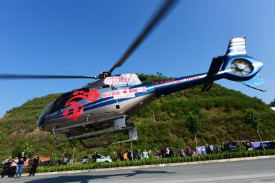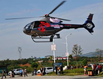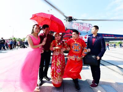10日1日是国庆节,这天十堰市郧阳区柳陂镇金矿村上演了一场山区汉江上空的空中精彩婚礼。新郎叫王铭,他今天迎娶的新娘林淑霞是福建人,十几年打工生活让他们终于有了自己的事业,多个省份都有他们的产业。新郎王铭更是有着10余个国家的打工和创业经历,在而立之年又遇上了志同道合事业有成的新娘林淑霞。为办好俩人别具一格的婚礼,他们策划了空中婚礼,并把日子选在了国庆节。国庆节上午新郎王铭和新娘林淑霞从十堰城郊登上直升机向郧阳区飞去,直升机两侧贴上了他们俩人设计的粘贴画,"铭记霞心 幸福一生",上为我们结婚了,下为2016年10月1日。直升机飞越开发区。汉江二桥、郧阳城区、郧阳岛、老柳陂镇、正在建没中的汉江三桥到达新柳陂镇上空,在新柳陂镇上空飞行多圈后降落在新柳陂镇公园广场,乘婚车来到新郎王铭家,按照郧阳民俗,在端洗脸水、上茶之后,新娘林淑霞为公婆端茶并改口叫爸妈,一场由农民小伙举办的直升机空中婚礼圆满落幕。