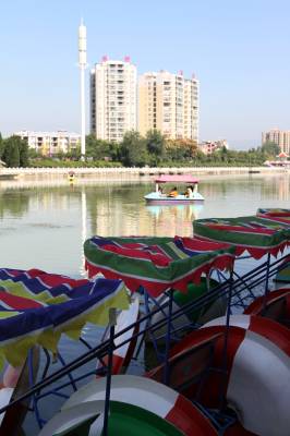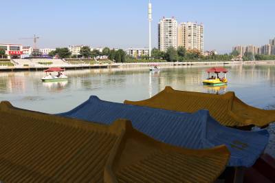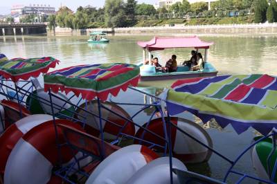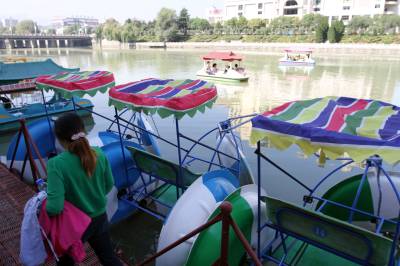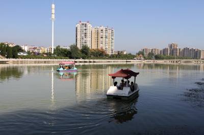 10月1日,游客在十堰市房县城区河流人工湖荡舟悠闲。当天,来自上海、河南、浙江等地的游客在房县河流人工湖,亲历感受湖水清清,野鱼成群的天然生态水环境。据悉,当地先后投资6亿多元,生态治理环抱城区河流,兴建河流人工湖17座,蓄水800万立方米,年实现旅游收入近20亿元,成为鄂西北最耀眼的水上旅游、垂钩、悠闲圣地。