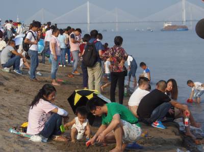 秋风秋雨过后的江城,在国庆小长假里,秋高气爽,气温回升。10月4日下午,有数千市民和外地游客,在汉口江滩水位急剧下降的青砂滩上,赏江景,晒太阳,男女老少挖"地道",埋"地雷"重温童年时代,找回国庆小长假的乐趣。