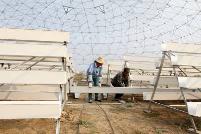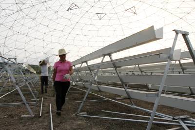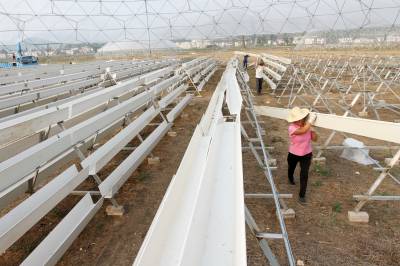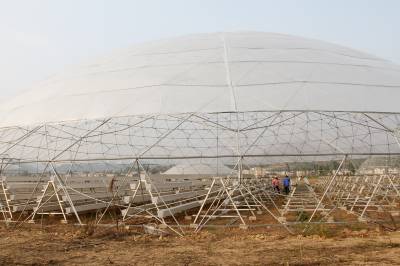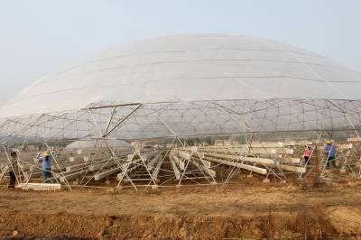 10月6日,技术人员正在安装房县禾益生态农业观光园“蒙古包大棚温室”无土栽培槽。当地禾益生态农业观光园地处军店镇何家村,连片规模达2000亩,投资1.5亿元,采取立体种植全生态、符合欧盟标准的蔬菜、花卉,并且缩短植物成熟时间三分之二,提升土地利用效益6倍。目前,大型“蒙古包大棚温室”配套设施安装进入最后冲刺阶段,油用牡丹花观赏、果蔬釆摘基地等农业观光项目已投入使用。据悉,当地高效生态农业观光产业年实现收入超过1.5亿元,将带动种植油用牡丹5万亩,大大拓宽了农业观光增收渠道,为鄂西北乃至全省发展高效生态观光农业起到示范引领作用。