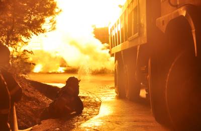 根据现场情况,消防官兵立即将现场警戒区域半径扩大至500米,疏散围观群众,利用开花出水的方式交替掩护,对着火点进行冷却灭火,随后用水枪压制火势,配合进行沙土覆盖。经多部门协同作战5小时,大火被扑灭,未造成人员伤亡。