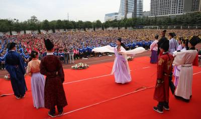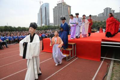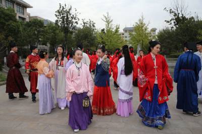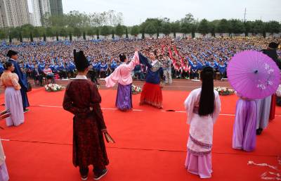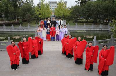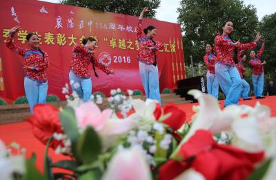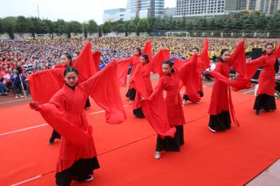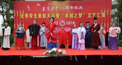 10月8日,学生们在舞蹈上表演汉服秀。 当日,湖北襄阳五中举办114周年校庆,颁发校友刘道玉教育基金会在襄阳五中设立“刘道玉创造教育创新成果奖”,师生们同台以文艺汇演等形式展示百年名校的风采。