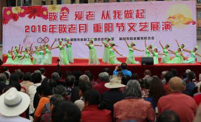 10月9日,由襄阳市老龄委、市助联合会主办的“敬老爱老从我做起,2016年敬老月重阳节文艺展演”在襄城区檀溪湖社区隆重举行。16个文艺团体的演职人员,为社区老人们献上一场文化盛宴,让他们在较高的艺术享受中欢度九九重阳节。 (视界网杨东摄)