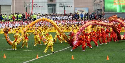 10月12日至20日,“江汉杯”2016年中国中学生足球锦标赛在湖北省武汉市举行。来自全国15个省市区的24支男女髙中生足球队齐聚江汉区,争夺桂冠。12日下午,在省足球传统学校武汉市十二中学,举行了开幕式和文体表演,该区10余所中小学师生向全国各地中学,展现了市区德智体美全面发展的风采。 图为开幕式上的小学生龙腾起舞,庆祝长征胜利80周年和中国少先队成立67周年,期盼中国足球似龙崛起,冲向世界。