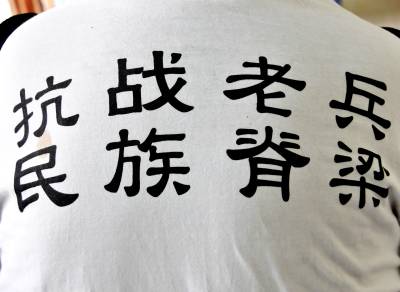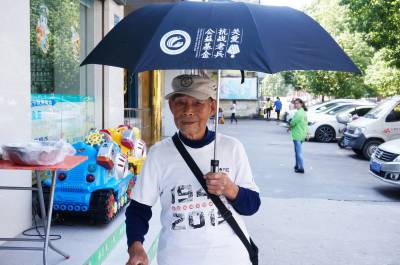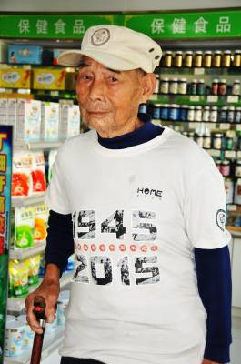在十堰市郧阳区的大街上过往行人都经常可以看到一位1.65米个头的老人拄着手杖走在大街上,特殊之处是无论天有多热老人头上都戴有一顶特别的帽子,帽子前有一个头载钢盔身背步枪的抗战士兵的头相徵章印在上面,外圆圈上印1945和2015字样,下印抗战胜利七十周年纪念。而最为抢眼的是老人身穿白色T恤的前胸,上排印有大大的黑色字体1945字样,下为一行红色小字抗战胜利七十周年纪念,在下一排又印有大大的黑色字体2015字样,字样中套有抗战体栽画面。而老人身穿白色T恤的背后印有双排大字,上排是抗战老兵四个字,下排印有民族脊梁四个字。老人身穿白色T恤的左袖臂章与帽微一样内容。老人一身特殊的穿戴引起了我的好奇,拦住老人询问,您是抗战老兵吗?老人回答是,老人叫孙来福,今年89岁。