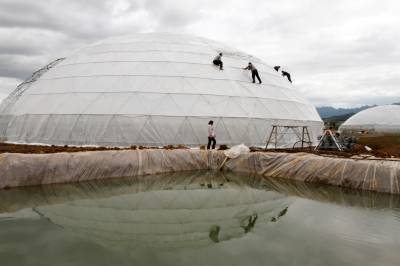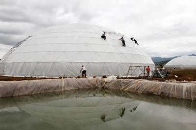 10月16日,技术人员正在覆盖房县禾益农业科技生态园“蒙古包大棚温室”保温保湿塑料膜。湖北禾益农业科技开发有限公司投资1.5亿元,在当地开发油用牡丹、草莓果蔬基地,实施“公司十基地十农户”的形式,对精准扶贫户免费技术培训,提供油用牡丹、草莓种苗,与农户签订保价回收合同,仅种植油用牡丹一项每亩平均增收6500左右。据悉,禾益农业科技开发有限公司带动农户培育5万亩油用牡丹,项目全部发挥效益后,将助力2500户精准扶贫户跨入致富康庄大道。