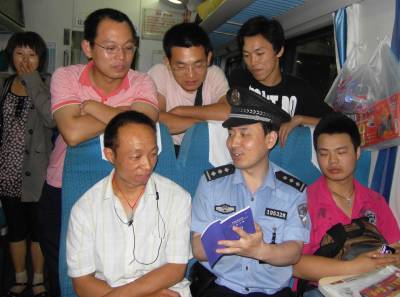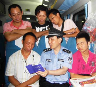 【罗超】6.26国际禁毒日来临之际,襄樊铁路公安处乘警支队打响旅客列车禁毒保卫战,倡导广大乘警走进车厢,广为宣传,参与禁毒斗争,构建和谐社会,把毒品卡在站外车下。图为进京列车乘警午夜时分给旅客详细介绍新型毒品种类与危害。