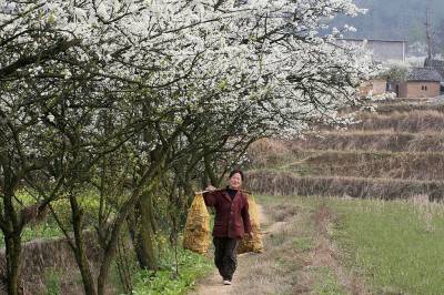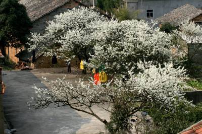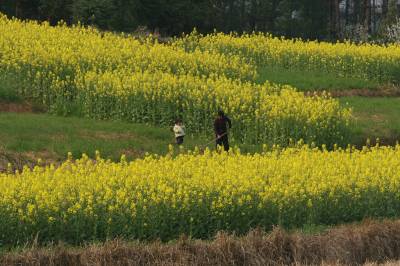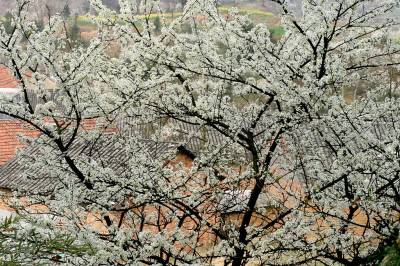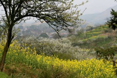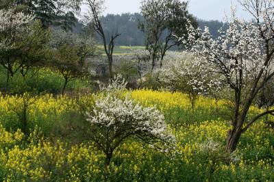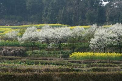 湖北大冶市殷祖镇的丁家山村,山峦环抱,全村大力开展果树种植,每年三月,漫山的李花与遍野的油莱花相继盛开,形成美丽的村景.