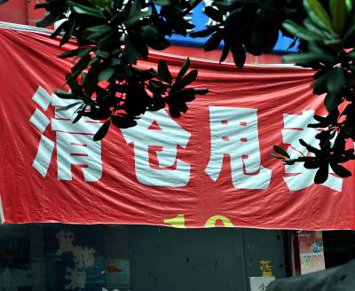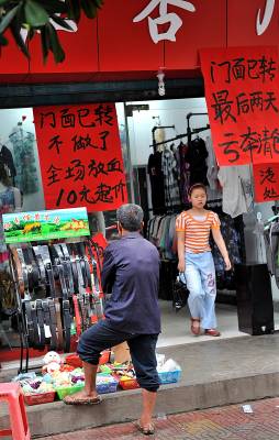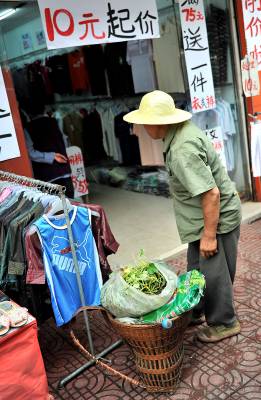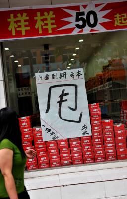 6月26日,宣恩县城区数家服装、鞋袜、小百货商店,促销的喇叭声不绝于耳,而临时或者是固定的”清仓”、”甩卖”标语一幅比一幅大——一年四季皆”甩卖最后两天”、”含泪抛售”等极具宣传、鼓动色彩的语言,让不常进城的农民们跃跃欲试。只是对生活在城市里的人,这类宣传并无多大效果——因为这类”甩卖”常年如此,人们已习以为常了——所谓”最后两天”的牌子挂旧了就换块新的,只是农民朋友不知道换了新牌子而已。(视界网签约摄影师:宋文摄)