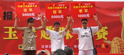 2010年6月26日上午,湖北省武汉市汉南区人民政府与武汉晨报联合主办的”思来”杯吃甜玉米趣味大赛在汉口中百仓储常青店举行,经过近3小时的比赛产生了冠军、亚军和季军。图为三名获奖选手,冠军获奖五千元人民币,亚军获奖三千元人民币,季军获奖一千元人民币。
