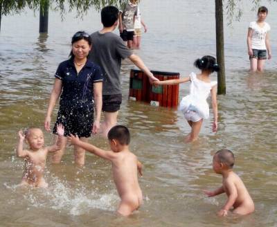 6月26日下午,在长江水涨后的汉口江滩,喜欢玩水的小朋友,在家长们的监护下戏水打水仗,玩得高兴不肯离开上岸。