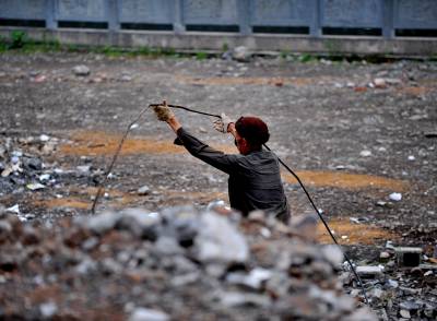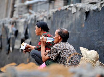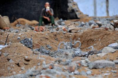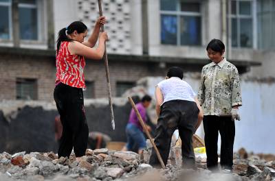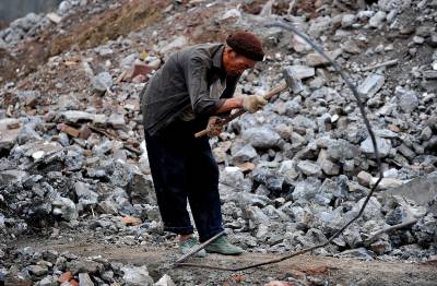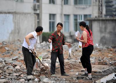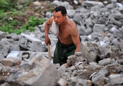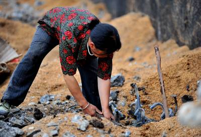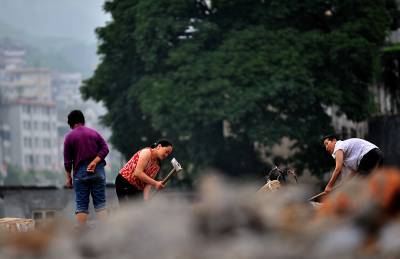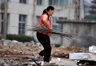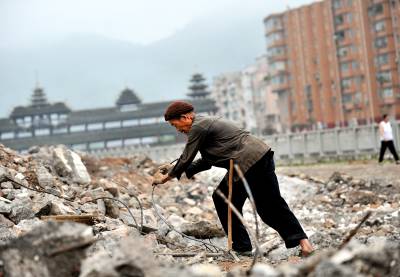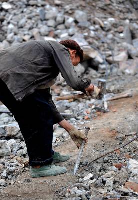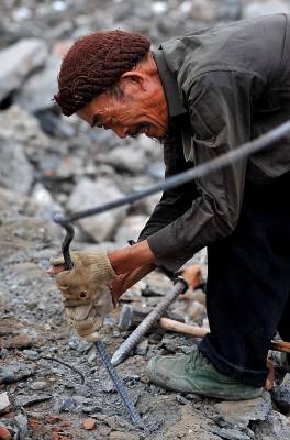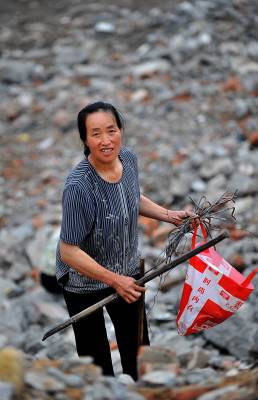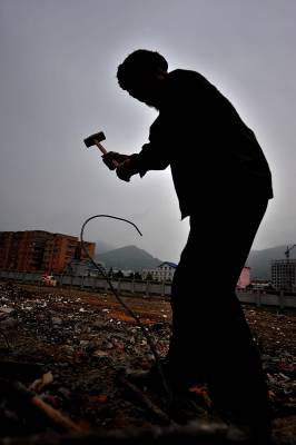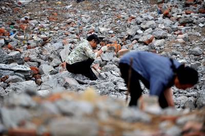 27日天刚蒙蒙亮,在宣恩县城区一工地废墟上,一群人背着背篓、拿着锤子钢钎等工具,艰难的砸开拆房子后留下的混凝土,取出其中的铁丝和钢筋;或挖开废墟上的瓦砾进行寻找。”只有拆除房子的工程队清理了现场、把容易拿走的铁丝钢筋全部清理了,我们才有机会到工地上来,砸开混凝土,取出里面的钢筋。”一名在工地上淘”金”的妇女说。她们以中年男女为主,一天到晚都在那些废墟上度过,一日三餐都在废墟上解决,而如果运气足够好,每天可以收入80元左右。(视界网签约摄影师:宋文摄)