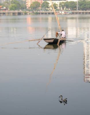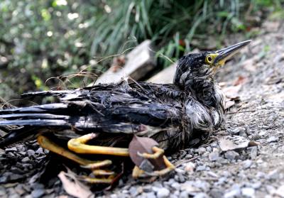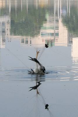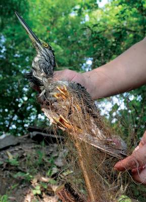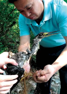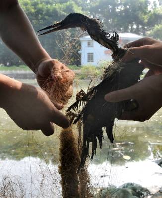 鸟儿湖畔落网市民报警救助27日早晨,在黄石市青山湖畔早锻炼的廖师傅发现一只鸟儿被湖中的网子网住,鸟儿拼命挣扎,已经奄奄一息。他马上打电话报警,同时给市野生动物保护站打电话求救。记者接到廖师傅电话后,马上赶到现场。在青山湖畔九曲桥旁,几根长长的竹竿间断地插在湖水中,竹竿中间牵着肉眼看不见的细丝网,丝网上倒挂着几只大小不一的鸟儿,有的不能动弹,已经死亡。据廖师傅介绍,这是承包青山湖养鱼的老板安放的,他是为了防止鸟儿食鱼竟下此毒手。在此早锻炼的市民纷纷指责鱼老板的不法行为,在公安干警和野生动物保护站工作人员赶到之前,一自称是打工的渔民迅速划船收起捕鸟的网子。赶到现场野保站的工作人员没收了鸟网,还从网中救下一只夜鹭。据他们介绍,被网住的另一只鸟是鸱鹭,它们都属省级保护动物。图八:在网中拼命挣扎的鸱鹭。图一:一自称是打工的渔民迅速划船解下受困的鸱鹭并收起捕鸟的网子。图二:被网子挂伤的鸱鹭已经无法飞翔,它痛苦地爬上岸边的石头。图三,四:市野生动物保护站的工作人员正在救助一只被网住的夜鹭。图五:市民看着可怜的鸱鹭无法救助。图六:浑身被网子缠住无法动弹的夜鹭。图七:被解救的夜鹭渴望飞翔。黄石市黄石日报摄影部邱孝威摄影报道电话13807232603邮编435002