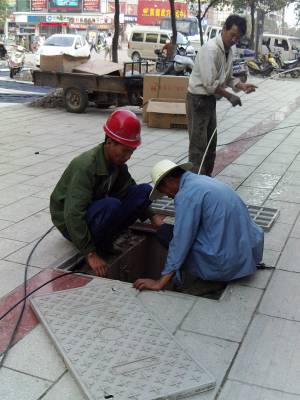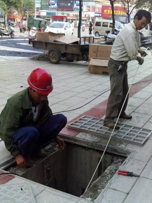 ”天线”入地美化城市6月26日,施工人员在武穴市老城区道路基础设施改造现场”穿地引线”,将城市上空的电线电缆”请”到地下。过去,该市街道上空供电线、电话线、闭路线等多种线路,或捆绑一起左牵右搭,或各行其道,”飞”街”走”墙,不仅带来了安全隐患,而且严重影响了市容市貌。为改变这一状况,今年以来,武穴市投入资金6800余万元,在老城区道路改造升级过程中,规范空中线路走向,实施空中线路统一入地工程。经过规范化改造,城市的天空更开阔,市民的感觉更良好。(本报视界网郭占军摄)