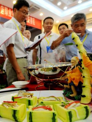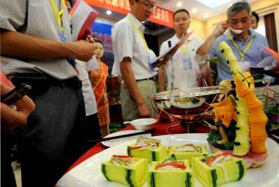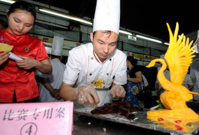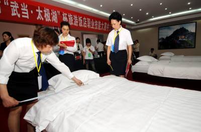十堰:38家星级饭店比职业技能第四届世界传统武术节将于今年10月在十堰举行,为给武术节中外来宾提供优质服务,同时行业提高职业技能,十堰市于昨日举办了旅游行业星级饭店职业技能大赛,全市38家星级旅游饭店近百名员工参加了客房服务赛(中式铺床)和厨师烹饪赛两大比赛项目。据了解,此次比赛获得前10名的烹饪大赛选手将被授予”十堰市旅游饭店十佳名厨”称号,参与”中式铺床”选手的比赛成绩,将作为评选十堰市”十佳服务员”的重要依据之一。图片说明:A:8名国家特一级烹饪师现场品尝打分。B:烹饪师们精心烹饪拿手菜。C:中式铺床比赛,评委们用尺子进行考核。本报签约摄影师张启国