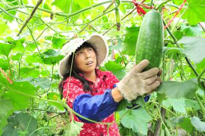 连日来,在湖北省宜昌市夷陵区黄花乡军田坝村,由宜昌星源生态农业专业合作社租用50多户村民承包地种植的大棚冬瓜即将进入采摘期,将定向销售到重庆、四川等地。今年,宜昌星源合作社采取”公司+基地+农户”模式在军田坝村种植大棚冬瓜200亩,产量将达到240万公斤以上,按订单销售,收入近200万元。本报视界网张国荣摄