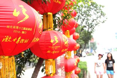 昨日,在荆门市城区象山大道,只见路两边绿化带内每隔一段距离就整齐地挂着数十个红灯笼,上有省十三运会的理念:”激情省运魅力荆门”,以及省十三运会的会徽和吉祥物。一排排火红的灯笼,将象山大道装扮得充满喜庆气氛,也让市民感受到浓浓的省运味。本报视界网朱运兵摄