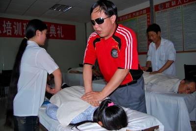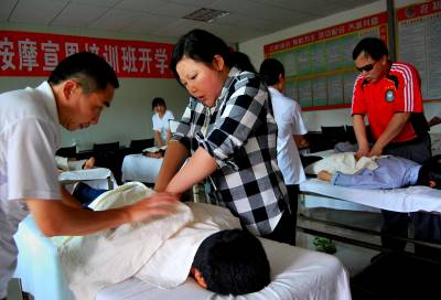 6月29日,在省残疾人培训中心在宣恩县残联举办的恩施州地区2010级盲人按摩培训班上,来自全州的30名残疾学员正在按摩老师的指导下,进行着一遍又一遍反复的现场操作技术培训。宣恩县残联作为恩施州地区唯一一个残疾人职业技术培训示范基地,自2002年以来,已累计为全州培训盲人按摩师近300名,95%的学员已在省内外就业,并有一大批学员开班起了按摩店,当起了老板。盲人按摩技术已成为我州解决盲人就业的一条有效途径。