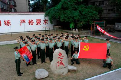 ”七一”前夕,省武警二支队六中队官兵组织全体党员,在省委大院开展重温入党誓词和忠诚卫士誓词活动。