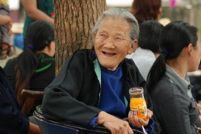 这是在湖北省鄂州市汀祖镇刘畈村大塘角湾祖堂建成时,唱大戏庆贺。在戏台下看到了一位白发苍苍、满面纵纹的老人,她始终满面笑容,快乐开怀的样子。我想这位老人的晚年是幸福的。祝愿健康长寿。