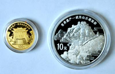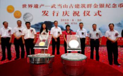 武当山古建筑群金银纪念币昨发行发行价3690元面向海内外销售昨日,由中国人民银行发行的世界遗产——武当山古建筑群金银纪念币正式发行。当日上午,中国人民银行、中国金币总公司和市政府联合在武当山紫宵宫举行武当山古建筑群金银纪念币发行庆祝仪式,并目睹了纪念币尊容。据了解,世界遗产——武当山古建筑群金银纪念币一套共两枚,其中1/4盎司金币1枚,1盎司银币1枚,均为中华人民共和国法定货币,发行价为3690元。金银纪念币正面图案均为中华人民共和国国徽,并刊国名和年号;金币背面图案为武当山太和宫金殿与云纹组合,并刊”世界遗产——武当山古建筑群”中文字及面额,银币背面图案为武当山古建筑群景观造型,并刊”世界遗产——武当山古建筑群”中文字及面额。金币含纯金1/4盎司,直径22毫米,面额100元,成色99.9%,最大发行量3万枚;银币含纯银1盎司,直径40毫米,面额10元,最大发行量6万枚。”发行世界遗产—武当山古建筑群金银纪念币,既能扩大中国人民银行业务覆盖面,带动金融效益的大幅提升,又对弘扬道教文化、宣传推介武当、打造世界知名旅游品牌具有十分重要的意义。”武当山古建筑群金银纪念币发行庆祝会上,武当山特区管委会主任李发平说。据悉,从昨日起,世界遗产——武当山古建筑群金银纪念币将面向海内外进行销售,收藏爱好者可通过查询中国金币网或拨打中国金币总公司客户服务电话4008—188—666了解相关情况。本报签约摄影师张启国