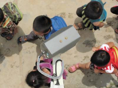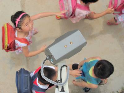 7月1日,湖北省十堰市郧县刘洞镇中心小学安装的电子监控系统正式投入试用,学生正从电子眼下经过。今年郧县县委、县政府从县财政经费中列支300万元,为全县义务教育学校统一配备专职保安,并安装电子监控系统。这标志着郧县各学校校园安保工作迈上新台阶。