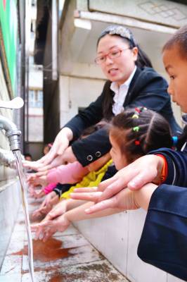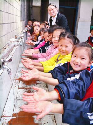 2017年2月28日,湖北省十堰市郧阳区柳陂镇中心小学老师指导孩子们学习正确的洗手方法。(图5-6)