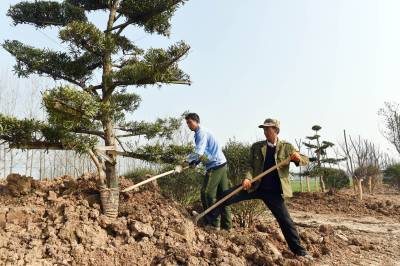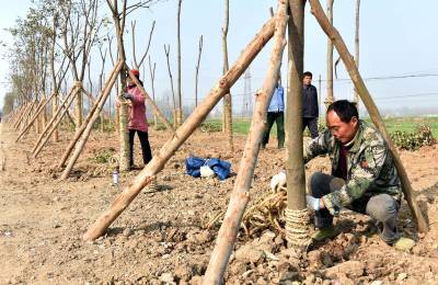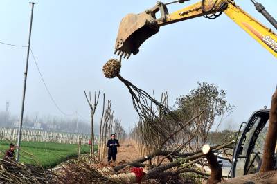 2017年2月28日,植树工人正在湖北省南漳县346国道武安镇路段栽植风景树。该路段从镇政府到兴发工业园区3公里。是今年绿满荆楚的范畴之意。今春一开年,该镇和林业部门投资210万元,由华中绿谷公司承担绿色长廊建设。路段主要分黄山栾、红枫、香樟、罗汉松和樱花5个区域。建成后将成为国道上的一道靓丽的风景。