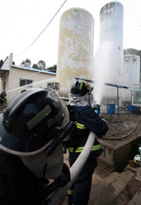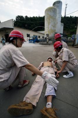 7月2日,宜昌市西陵区政府开展了危险品泄漏事故救援演练。演练假设在宜昌蓝天气体公司出现液氧储罐阀门损坏,导致液氧大量外漏,西陵区政府和安监局在接到事故报告后,迅速启动预案,由消防、医疗等部门组成的抢险组迅速赶到现场进行抢险堵漏和泄露点稀释,并开展救援工件。本报视网界刘明强摄