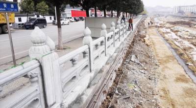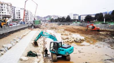 武当山剑河整治加速推进 3月4日,记者在武当山特区剑河整治项目建设施工现场看到,河道内大型挖掘机、小型夯实机一起轰鸣,平整河床,夯实游步道基础;岸边观景平台正在浇筑,河堤上新式仿古栏杆正抓紧安装,剑河综合整治加速推进。(郭军 摄)