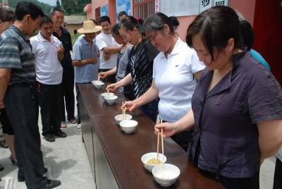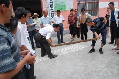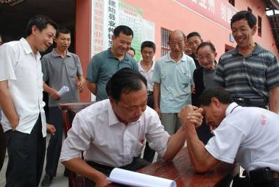 7月1日,业州镇罗家坝村的58名党员一如往年,集中在村委会庆祝中国共产党建党89周年,重温入党誓词,学习新党章。全体党员又集中在院子里,开起了农村党员趣味运动会。一双双拿锄把的手做起了秀气活—用筷子捡黄豆(图一);打不了乒乓球,我端着球跑(图二);扁担也成了运动器械(图三);农家人讲究的是有把力气,放张桌子,就又比拼上了掰手劲(图四)。罗家坝村是一个3000多人的大村,连续16年无刑事案件和有影响的治安案件,无”毒、赌、黄”等平安村级建设”六无”,这和党员倡导健康、向上的文化、娱乐方式分不开。如何正确引导群众的业余生活,罗家坝村党员为群众做出了表率。