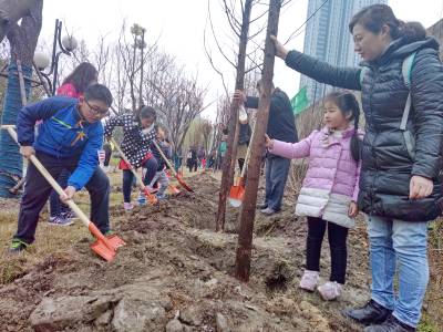 好妈妈从武昌护两孩到汉口菱角湖公园学雷锋义务忙植树