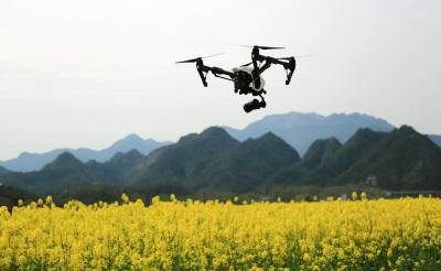 3月14日,在湖北省远安县旧县镇,无人机正在航拍沃野美景。连日来,远安油菜花相继盛开,在色如渥丹、灿若明霞的丹霞山下,浓郁花香让人沉醉,吸引了大批无人机爱好者前往拍摄。结合赏花嘉年华、田野马拉松等活动的举办,该县将无人机飞行安全监管问题列入重要课题,取得了积极成效。(温宜飞摄)